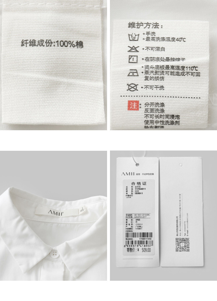 | 洗涤标准: | 不可浸泡悬挂晾干不可干洗不可漂白110℃以下垫布熨烫40℃以下手洗 |