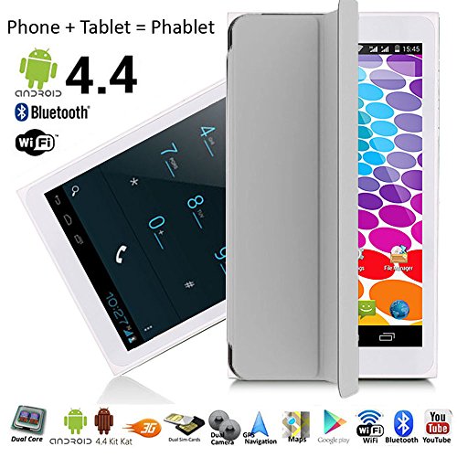 -. Feature : 2-in-1 Tablet and SmartPhone - 7.0 Inch Display - Android 4.4 KitKat - Can be used as Tablet , Phone, or Both! / CPU: Cortex-A8 Processor @ 1.5GHz - 4gb Memory (Can take 32gb microSD) - Bluetooth 3.0 - Dual Camera (Front & Back) / GSM Unlocked - Supports 3G GSM QuadBand: GSM 850/900/1800/1900MHz WCDMA 850/2100MHz | Dial and Receive calls / Google Play Store Support - Access to millions of free and paid-for apps available to download directly to your tablet / WiFi 802.11 b/g/n Support - Connect to the internet via WiFi or SIM Card