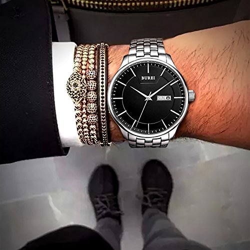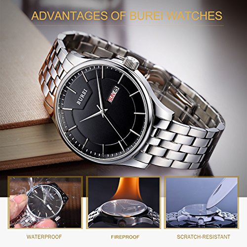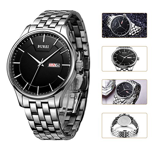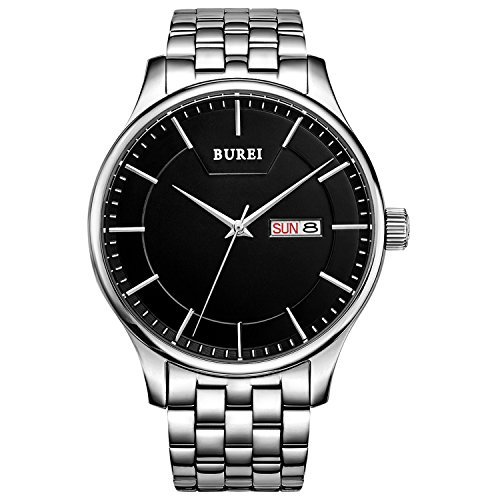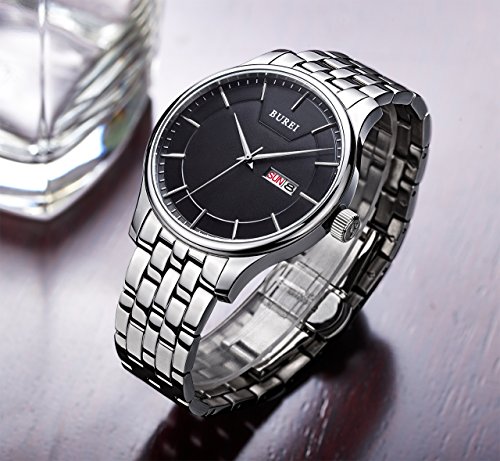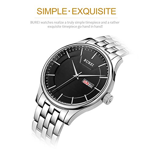 (《바오쇼》)BUREI 손목시계 맨즈 심플 쿼츠 아날로그 표시 화이트 문자판 스테인레스 벨트 날짜,요일 표시 아버지의 날 기프트