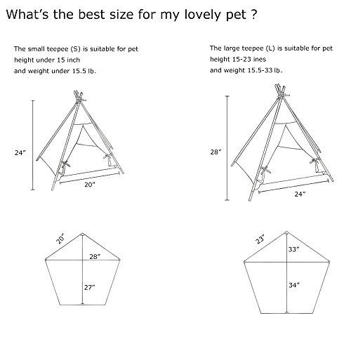? What's the Best Size for Your Pet? We have two tent sizes (L S). Please check the product dimensions and measure your pet before buying. If you pet height is under 15 inches and weight under 15.5 lb choose the small teepee (S); If your pet height is 15-23 inches and weight 15.5-33 lb choose the large teepee (L). In between size choose the larger one. ? L (Large): H*W= 28* 24 inches S (Small): H*W= 24*20 inches Please refer to the picture for the detail dimensions. ? Package Contents: 1* Cotton Canvas Tent 5* Pine Wooden Pole Note: The cushion and chalkboard is not included. 0 |