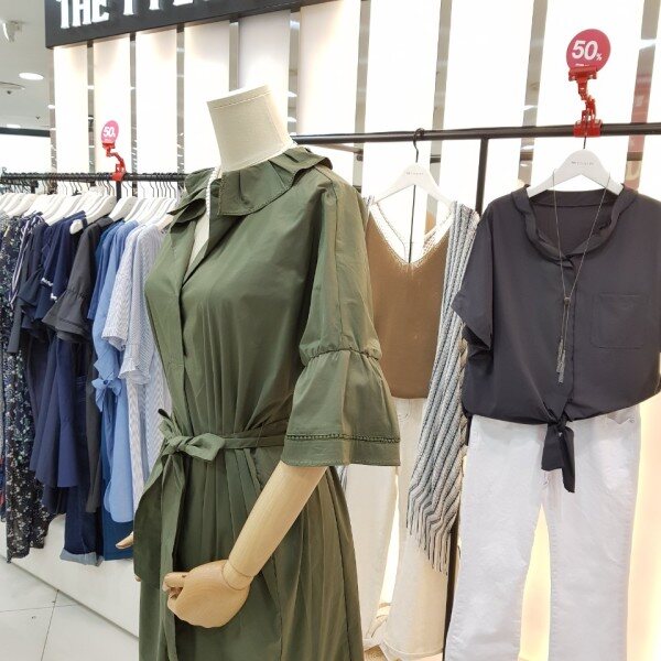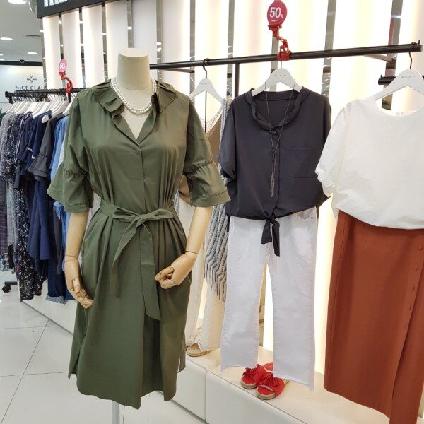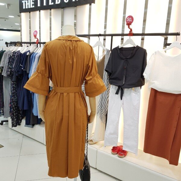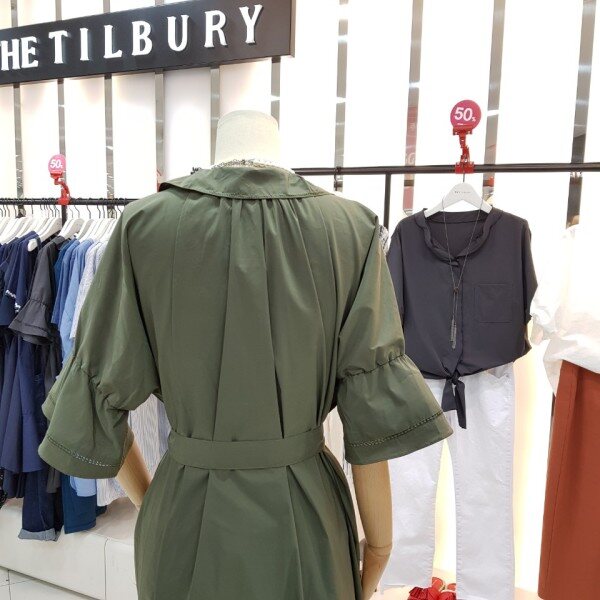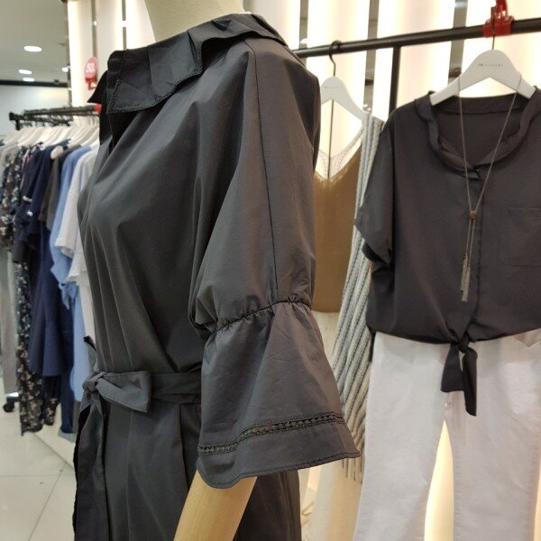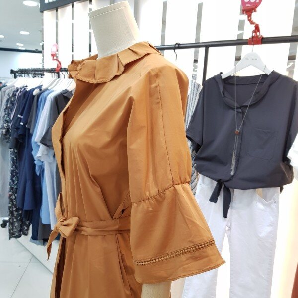 주름넥라인에 소매부분 자수펀칭이 있는 여성스러운 스타일의 원피스입니다.벨트로 허리라인을 잡아 슬림하게 연출하시기 좋습니다.