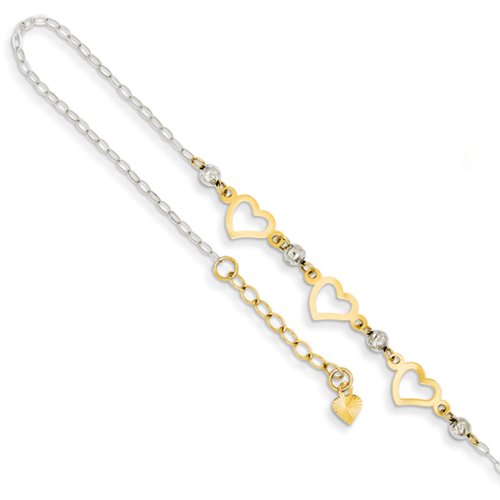 Flirty and feminine, this 9-10 inch adjustable bracelet will wrap around your ankle with elegant sensuality. It is created from 14k two-tone gold and features a 1mm oval link chain finished with a 1-inch extender and spring ring clasp, 3mm diamond-cut beads and 7mm polished open hearts.Feature