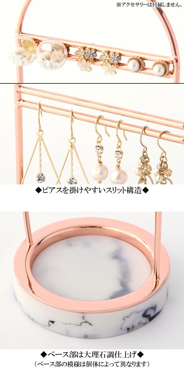 ピンクゴールドの本体と大理石調のトレーの組み合わせがゴージャスなピアススタンドです。ピアスを掛けやすいスリット構造になっています。装いを華やかに彩るアクセサリーだからこそ、使わない時も美しく佇むギャラリーのような収納がお似合いです。ベース部は大理石調仕上げですので、個体によって模様は異なります。 |
