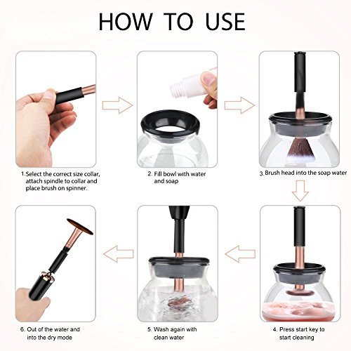 - ♥ Easy To Use:Just three quick steps to clean makeup brushes. 1. Attach the brush to the spinner. Pour water and soap into the bowl. 2. Spin to Rinse 3. Spin to Dry.