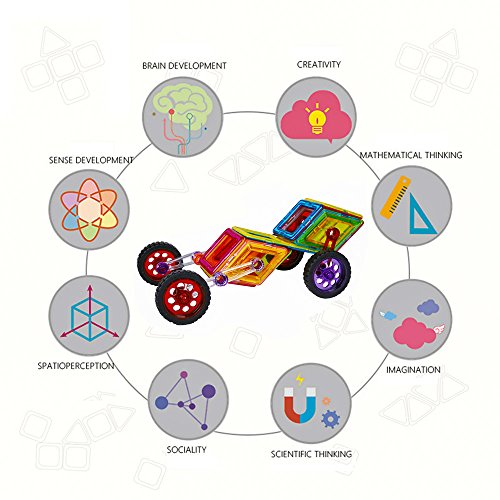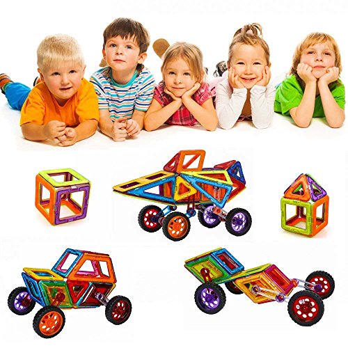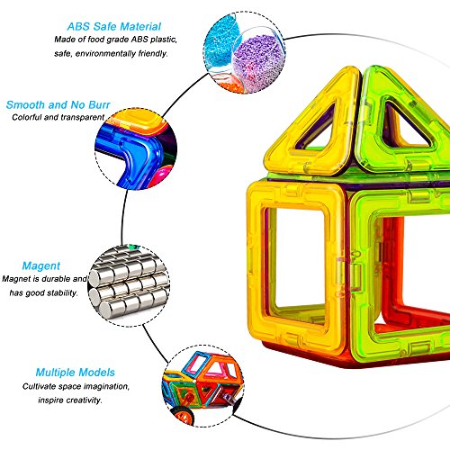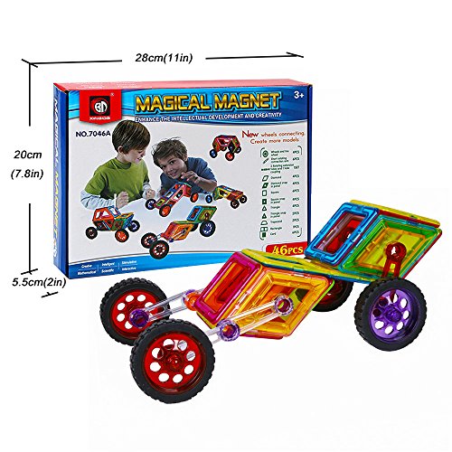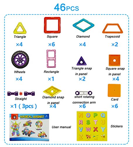-. Feature : 【safe material】: the magnetic building blocks is made from non-toxic ,high quality imported pc material conform to ce, astm and en74. Smooth edge of each tile will never hurt baby's little hands. / 【develop multiple skills】: this building toys set can be combined into many patterns, could develop children's fine motor development, cognitive development of color, teamwork ability, artistic cognitive, sensory, cognitive ability, practical ability, imagination and creativity. / 【fits for children above 3 year-old】:this building set builds fine motor skills in toddlers and inspires imagination and an interest in science, engineering and design in older children. Fits for children above 3 year-old, best educational stacking kits for your boys and girls. / 【magnetic and easy clean up】: powerful magnets make playtime more fun, the magnetic tiles connect to each other strongly with firm construction, magnetic effect will not changed after long use; easy to clean them up and storage since magnet sticks together. / 【best choice for beginner】: totally 46pcs: 4 x wheels and tire wheel, 6 x short rotating connection arm, 2 x rotating extension tubes, 1 x tube coupling , 4 x diamond, 4 x diamond snap in panel, 6 x square, 4 x square snap in panel, 4 x triangle, 2 x triangle snap in panel, 2 x trapezoid, 1 x rectangle, 6 x card. 2 different random colors on each side of each magnetic tile. Can upgrade by buying more blocks.
