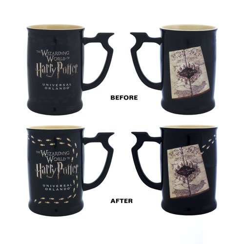 Product Description Heat-activated footprints circle this black ceramic mug, from the words "The Wizarding World of Harry PotterTM Universal OrlandoTM" on one side, to the Marauder's Map decal on the other. The footprints appear when a hot beverage is added to the mug. Formed handle provides comfortable grip. 0