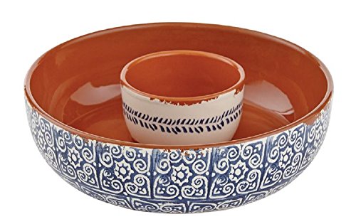 Product Description2-piece set. Glazed terracotta chip bowl features hand-stamped tile pattern exterior and glazed natural terracotta interior and rim. Pairs with removable hand-stamped leaf pattern dip bowl. Size: chip 2 1/2" x 10 1/2" dia | dip 2" x 4 1/4" dia0