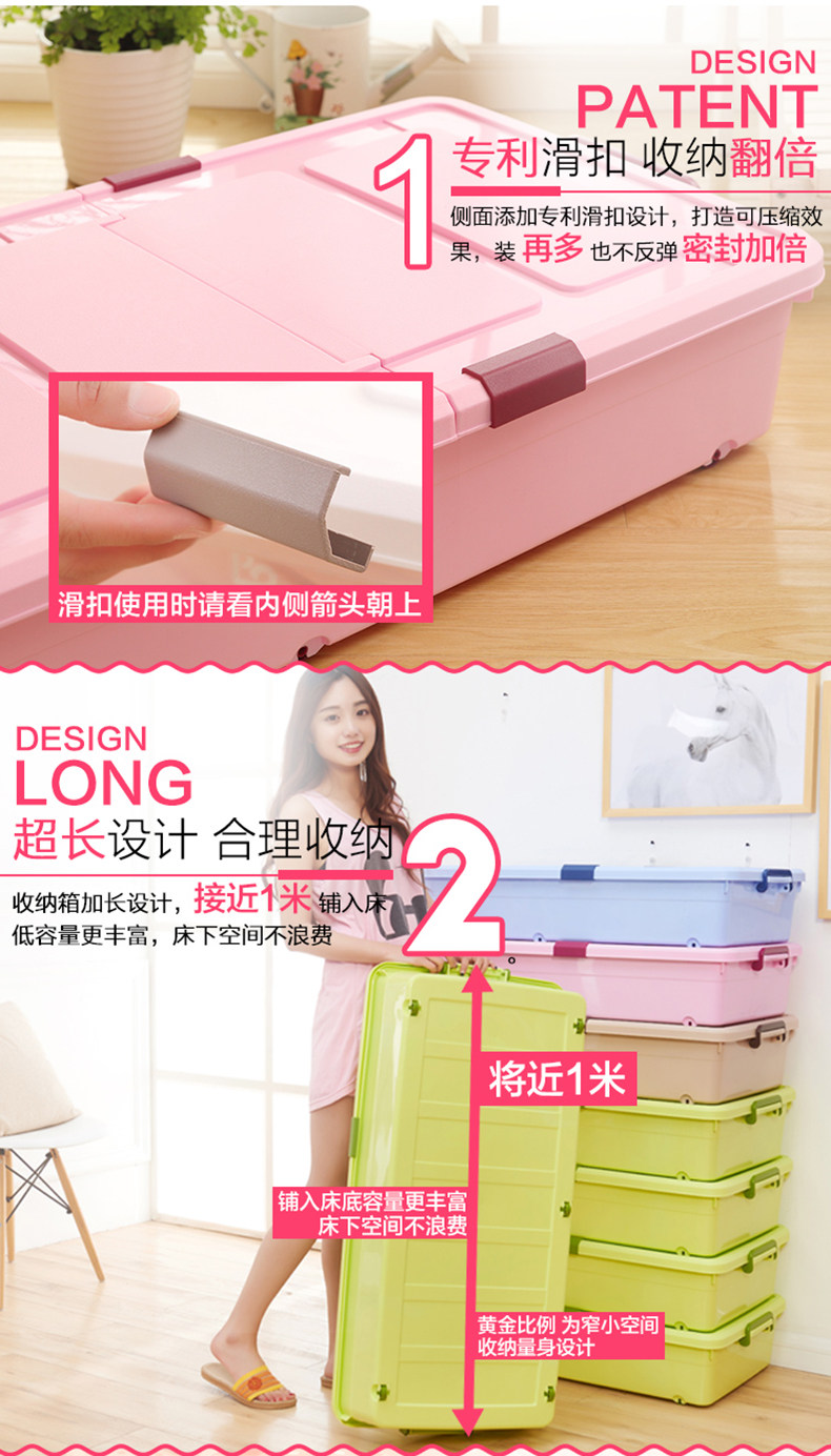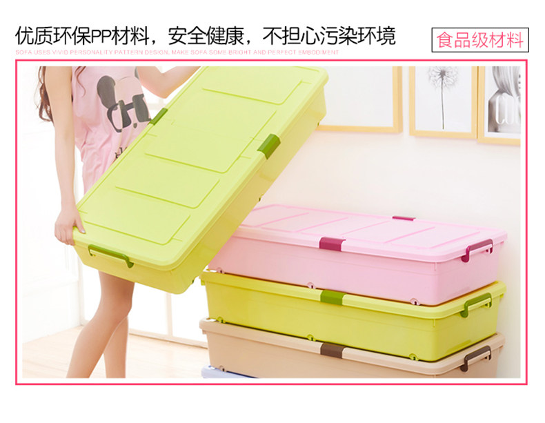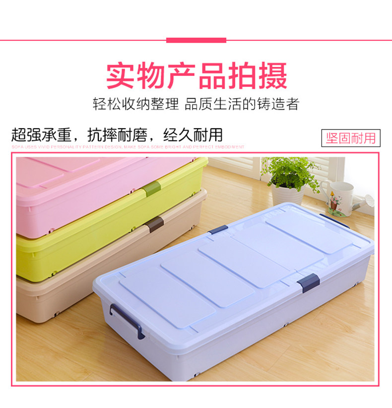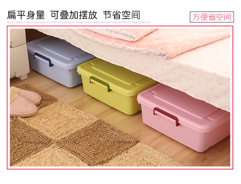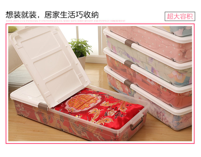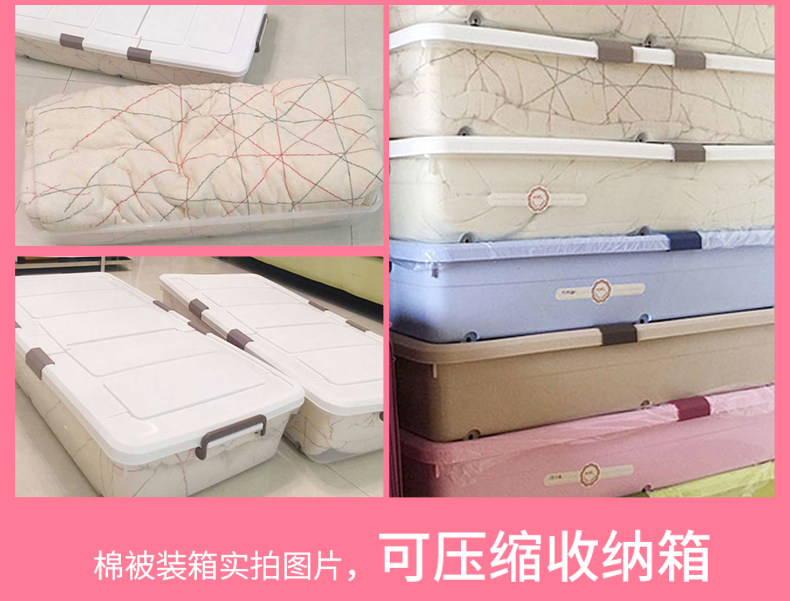 1个箱子大约能装10斤厚棉花被、多条丝棉被、20多双鞋子!超越压缩袋!书本、衣服、玩具,通通有序的塞进我们的床底、夹缝空间,纳得漂亮,会让你有惊喜收获!