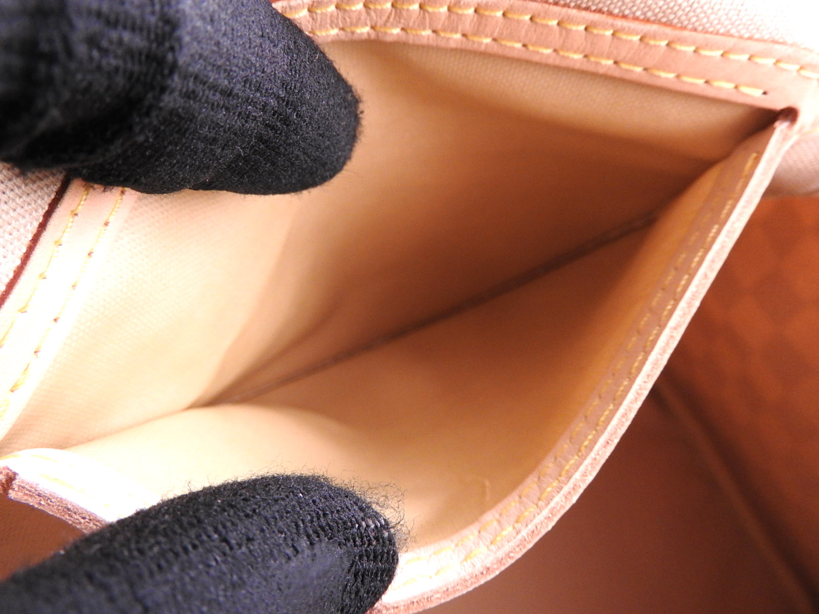 Damier Azur canvas: Barely used feeling. A few slight stains in the bottom. Leather: Barely used feeling. Slight stains and tanning. |