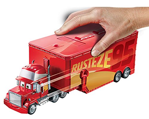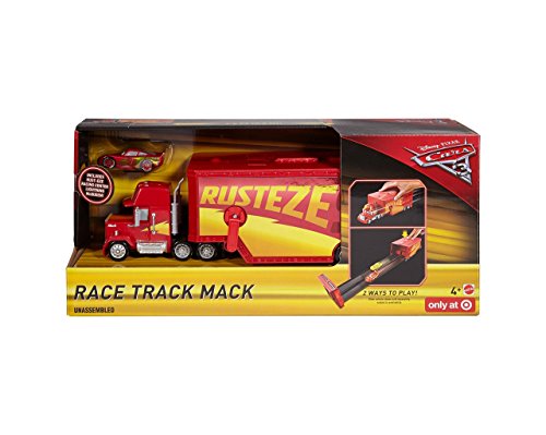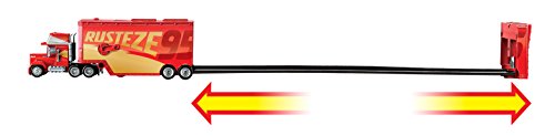 -. Feature : Cars 3 "Rusteze Racing Center" style Mack. / Trailer can be opened to reveal pull out track measuring 1.5 ft in length. / Mack dimensions when closed - 14 x 5 x 4 inches / Includes Rusteze racing Center Lightning McQueen