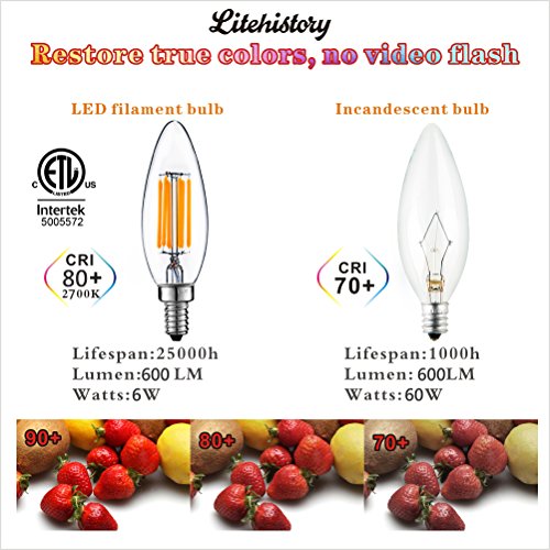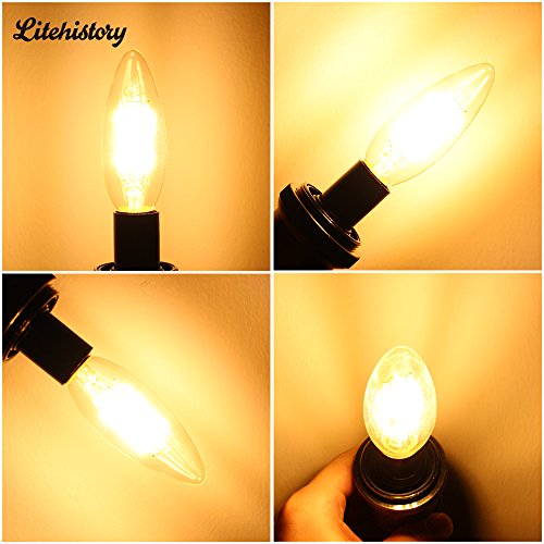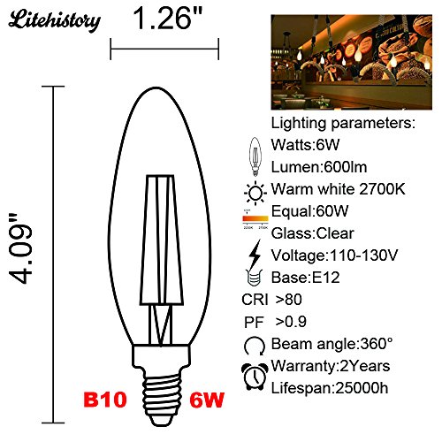 LiteHistory Deep Dimmable 6W filament C32/B10 led bulb,ETL,E12 LED Candelabra Bulb,600lm,60W equivalent led chandelier,Warm White 2700K led candle bulb,Blunt tip,Clear,6-Pack