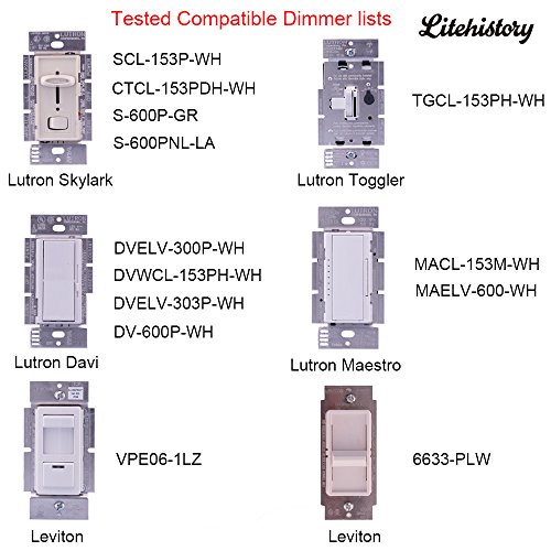 - Dimmer compatibility:Compatible with Lutron Skylark,Davi,Toggler,Maestro,Rotary Preset Dimmer(SCL-153P-WH,CTCL-153PDH-WH,TGCL-153PH-WH,MAELV-600-WH,S-600P-GR,DVELV-300P-WH,DVWCL-153PH-WH,DV-600P-WH,D-600P-IV,DVELV-303P-WH,MACL-153M-WH,S-600PNL-LA),Leviton VPE06-1LZ,6672-1LW,Leviton 6633-PLW,6631-1LT dimmer