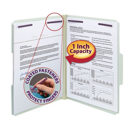 -. Feature : Protect your documents and fingers with Smead's patented SafeSHIELD® Coated Fastener Technology / SafeSHIELD(TM) coated fasteners prevent paper tears, finger cuts and excessive fastener crinkling / Heavy duty pressboard stock and Tyvek® gusset for extra durability / Made for large bulky files that get plenty of use / Two fasteners keep papers secure and in order / Contains 60% recycled content, 30% post-consumer material