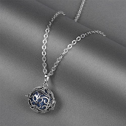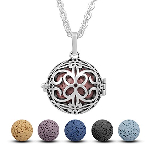 INFUSEU Lava Stone Aromatherapy Essential Oil Diffuser Pendant Necklace Butterfly Locket Silver Plated + 30" Chain + 5 Multi-colored Rock Beads