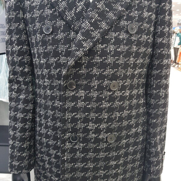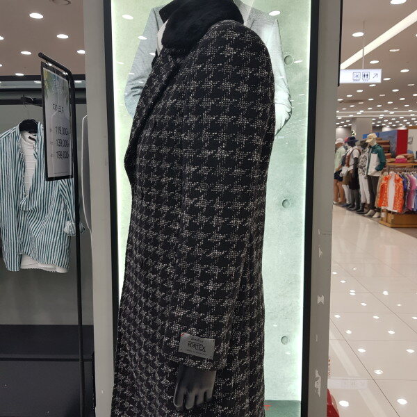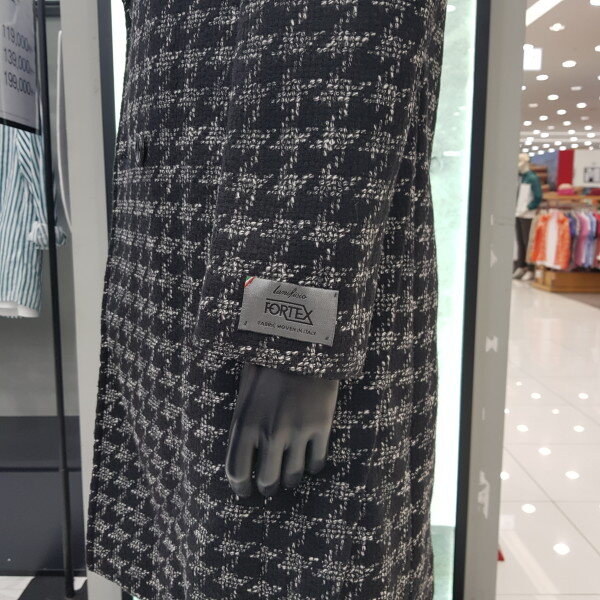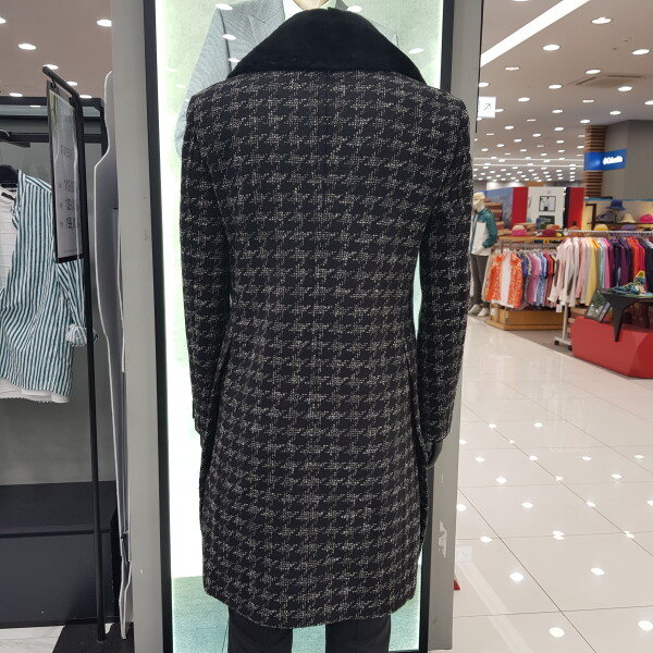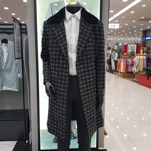 SIEG °FAHRENHEIT'FORTEX'의 빅 하운드 투스 팬시 소재로 와이드한 라펠의 더블 형태로 무톤 퍼 카라가 부착되며, 사이드 슬릿이 포인트인 롱 코트.