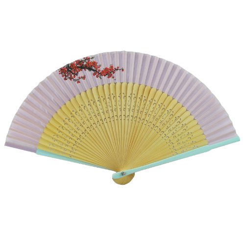Bamboo Folding Fan - Hand Painted Red Plum Blossom - Light Purple, Blue Edge