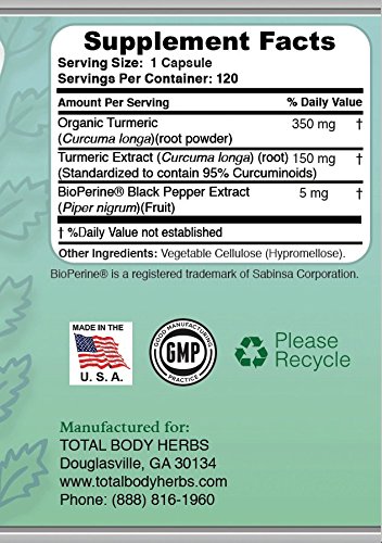 ALL THE GREAT INGREDIANTS IN ONE BOTTLE: 100% Certified Organic Turmeric - 350mg Also get 150mg of Turmeric Extract that has been Standardized to contain 95% Curcuminoids and You get 5mg of BioPerine Black Pepper Extract