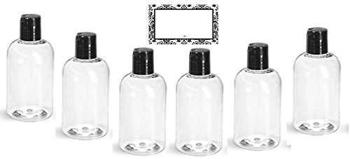 CLEAR PLASTIC REFILLABLE BAIRE BOTTLES, 4 oz with BLACK HAND-PRESS FLIP DISC CAPS - For TRAVEL OR GIFTING Soap, Shampoo or Lotion - PET, BPA...