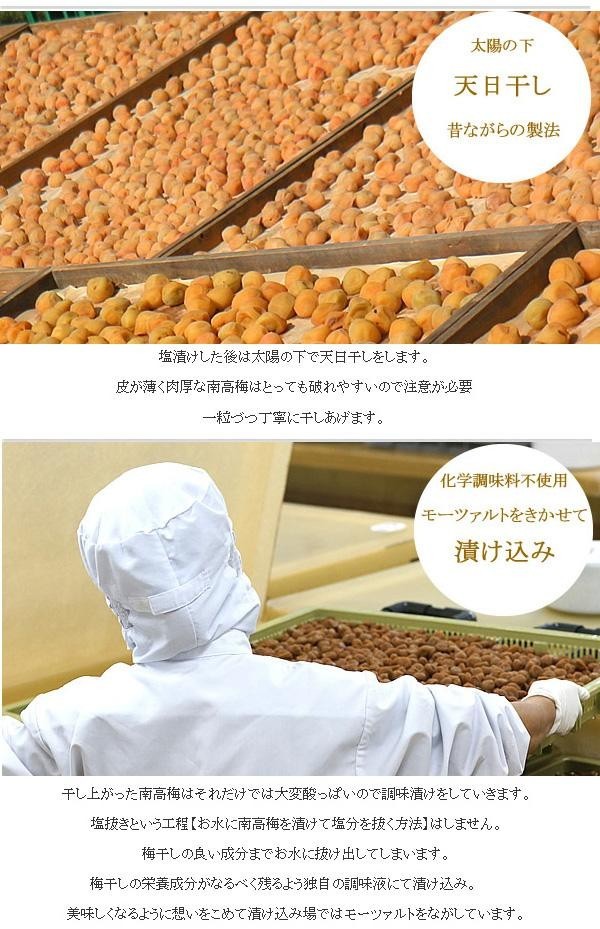 | 和歌山県産の南高梅の中でも上質な物を三代目が選別して使用。塩分6%のフルーツ感覚で食べることができる、甘い梅干し(ハチミツ不使用)です。 |