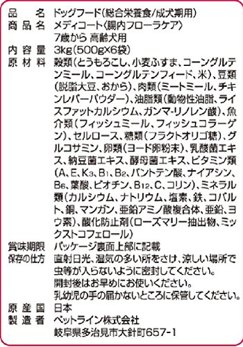 原材料:穀類(とうもろこし、小麦ふすま、コーングルテンミール、コーングルテンフィード、米)、豆類(脱脂大豆、おから)、 肉類(ミートミール、チキンレバーパウダー)、 油脂類(動物性油脂、ライスファットカルシウム、ガンマ-リノレン酸)、 魚介類(フィッシュミール、フィッシュコラーゲン)、セルロース、 糖類(フラクトオリゴ糖)、グルコサミン、 卵類(ヨード卵粉末)、 乳酸菌エキス、納豆菌エキス、酵母菌エキス、ビタミン類(A、E、K3、B1、B2、パントテン酸、ナイアシン、B6、葉酸、ビオチン、B12、C、コリン)、ミネラル類(カルシウム、ナトリウム、塩素、鉄、コバルト、銅、マンガン、亜鉛アミノ酸複合体、亜鉛、ヨウ素)、 酸化防止剤(ローズマリー抽出物、ミックストコフェロール)