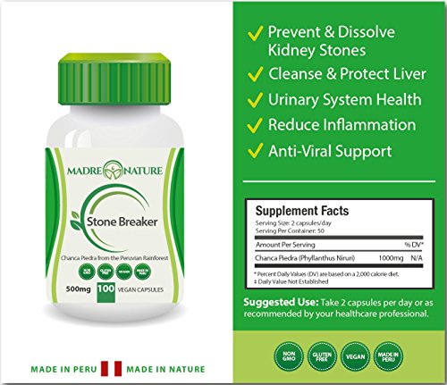 -. Binding : Health and Beauty -. Brand : Madre Nature -. Feature : KIDNEY HEALTH: The phytochemicals in Chanca Piedra combine to make an effective kidney tonic that reduces inflammation, repels microbials, and is an analgesic that relieves stress on the organs for proper function. / LIVER SUPPORT: Chanca Piedra helps increase bile production in the liver to allow the digestive process to function smoothly, so more nutrients are absorbed and waste is eliminated faster and more efficiently. / SOOTHES URINARY TRACT: Powerful antioxidants and phytochemicals help detox the body, increasing speed and quantity of urine output. / GENERAL WELLNESS: High in antioxidants so your immune system is supported. -. IsAdultProduct : 0 -. Label : Madre Nature -. Manufacturer : Madre Nature -. PackageQuantity : 1 -. ProductGroup : Health and Beauty -. ProductTypeName : HEALTH_PERSONAL_CARE -. Publisher : Madre Nature -. Studio : Madre Nature -. Title : 100% Pure Chanca Piedra (Stone Breaker) Supplement - 500mg X 100 Capsules (Vegan) - Amazon Rainforest - Non-GMO (1-Pack)