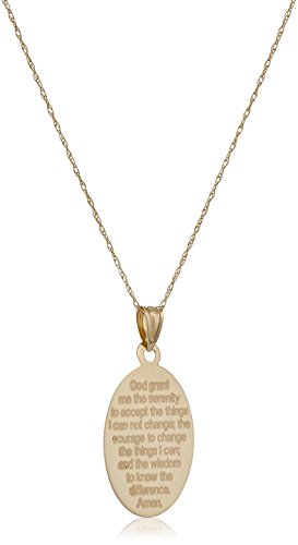 A reminder of a popular prayer, the 10k Yellow Gold Laser Oval Polished Serenity Pendant Necklace grants a sleek design to any neckline. Resting from an 18-inch rope chain is a 0.96-inch by 0.5-inch pendant that reveals a two-tone yellow-gold finish. While the bottom of the pendant features hands clasped in prayer, the top of the pendant reveals the laser engraved script that reads "The Serenity Prayer." Simple in design, this necklace is a wonderful gift.