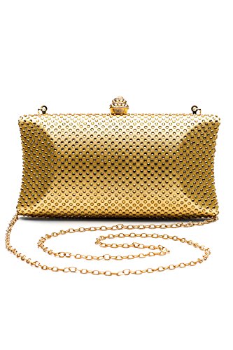 Clutch handbags come with a detachable chain strap and a rhinstone top clasp closure.