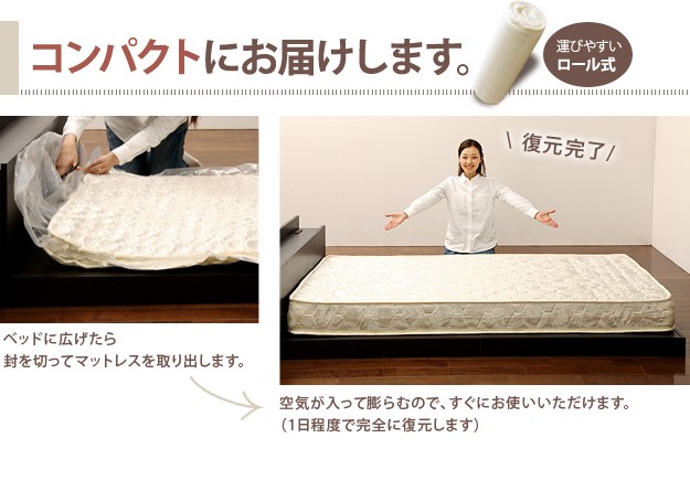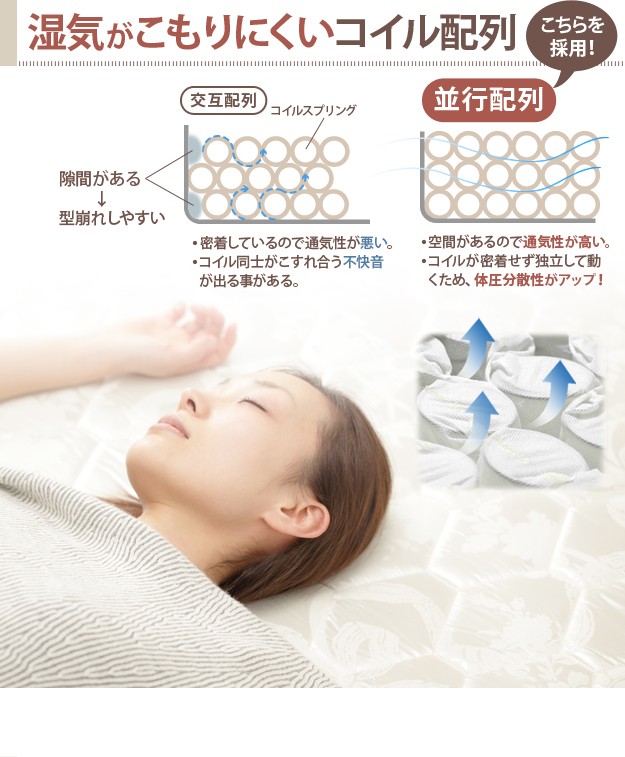●商品について:【ポケットコイルスプリングマットレス】独立した袋状のポケットにスプリングが1つ1つ入っている、体圧が分散され横揺れが少ないマットレスです。理想的な寝姿勢を保ち、ソフトな寝心地を好む方にお勧めです。