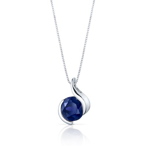 Center Stone: Lab Created Blue Sapphire, Round Shape, 8 mm diameter, 2.75 carats, Ceylon Blue Hue with Brilliant Sparkle. Pendant: 1.80 grams, Pure Sterling Silver with .925 stamp, Pendant features exceptional Design, Craftsmanship anding. Perfect gift for Mothers Day, Birthdays, Valentines Day, Graduation, Christmas or just about any other occasion. Money Back Guarantee. Includes a 18 inch Sterling Silver Box Chain, Signature Gift Box & style SP9492Feature