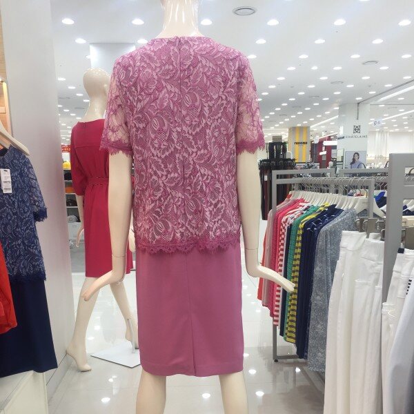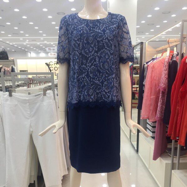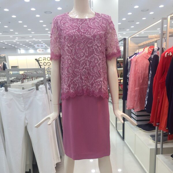 페미닌한 플로럴 패턴의 얇은 폴리 크레이프 소재를 믹스시킨 체형커버 원피스. 투피스를 입은듯 한 느낌을 주는 실용성 높은 스타일.