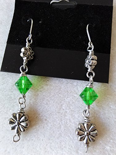 -. Title : Kiwi green glass and silver plated flower dangle earrings