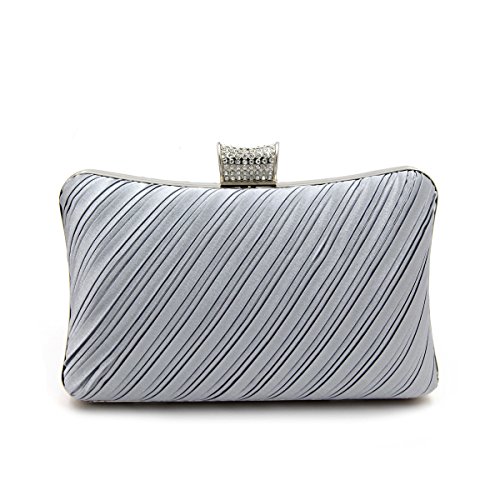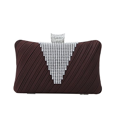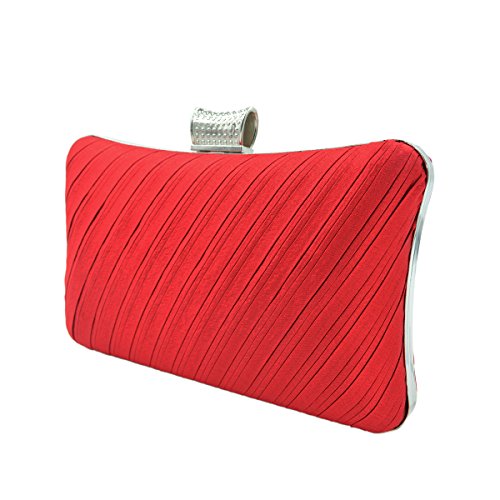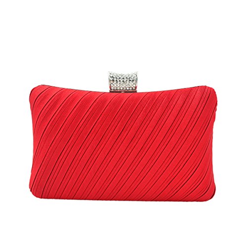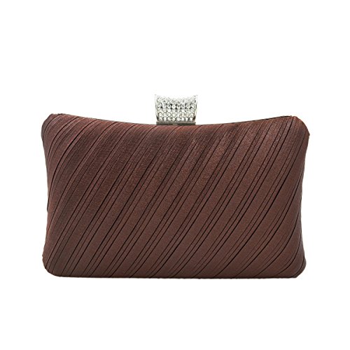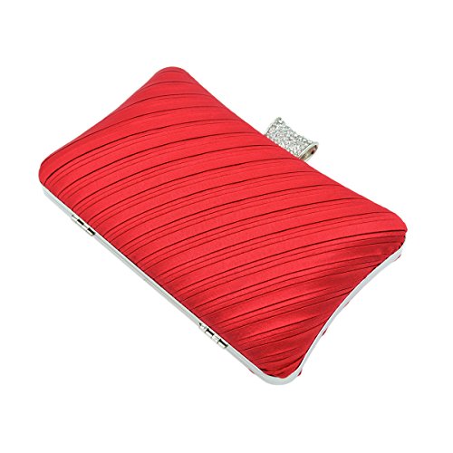 This premium quality evening clutch is both elegant and stylish. Pleated satin fabric with sparkling rhinestones crystal clasp top closure. Detailed fully lined hard clutch and divided interior compartment with interior zip divider compartment to keep your belongs safe and secure. Come with 2 sizes of removable hideaway chain straps: 8" drop and 23" drop. Stunning, functional and versatile. The size is 8" (L) x 5" (H) x 2.5" (W). Elegant design and luxury feel. A must have accessory for the perfect night out. TrendsBlue® is a registered trademark.Feature