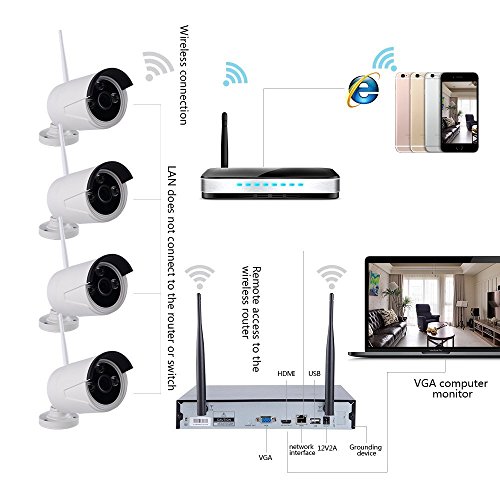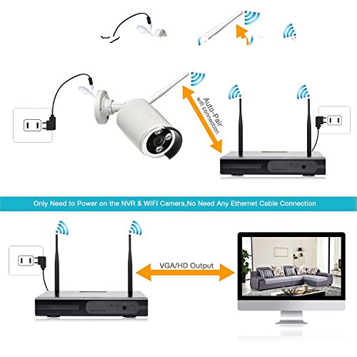 • Easy Set-up: Simply install the cameras where you desire, plug-in the power supplies, connect to your local WIFI network and go! The cameras will sync themselves.NOTED: The Wireless System Don't Mean You can Use the System without Any Cables. You have to Connect them to the Power Adaptors for Suppling Power to Camera and NVR