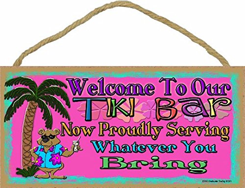 Tropical Bear Welcome To Our Tiki Bar Serving Whatever You Bring Sign 5"X10"