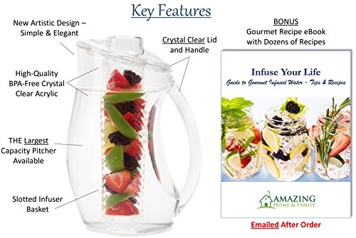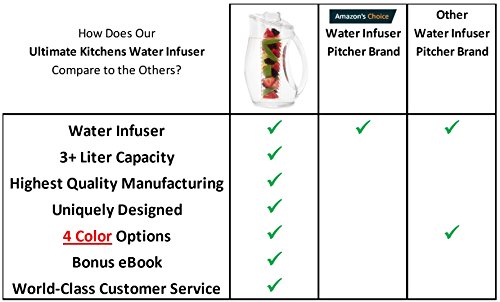 So WHY Choose The Ultimate Kitchens Premiere Brand of Infuser Pitchers? ? Beautiful Elegant - You will be excited to use your infuser pitcher for any occasion! ? High-Quality Smart Design - Unlike other infuser pitchers, you won't have to unscrew the lid to use or worry that the produce will fall out when you pour. ? Largest Capacity Water Pitcher Infuser - With your busy schedule, this will help you use your time wisely. ? BONUS Infused Gourmet Recipe eBook - Free with every purchase as our way to say THANK YOU! ? 100% Satisfaction Guarantee - If you aren't 100% satisfied with this infuser pitcher, we will refund your money with no questions asked!
