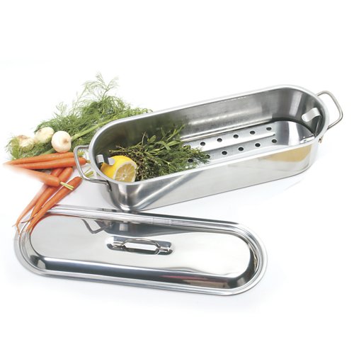 Excellent for all of your poaching needs the long and narrow 18 inch body of the fish poacher provides for the whole fish fish steaks or fillets. A sturdy perforated pull out rack allows for even delicate fish. The poacher cooks gently so the fish becomes tender and flavorful. Stainless steel poacher set includes a removable poaching rack.Feature