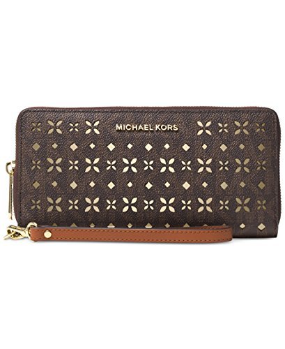 Carry it all in chic, polished style with this practical and still-so pretty zip-around wallet from MICHAEL Michael Kors. Designed in gorgeously perforated Saffiano leather, it features plenty of slots and pockets to keep your cards, cash and coins stylishly in check. 8-1/4"W x 4"H x 1"D 6"L detachable wrist strap Zip-around closure Exterior features logo 1 interior zip pocket, 3 inner pockets & 16 card holders Floral perforated Saffiano leather; lining: polyesterFeature