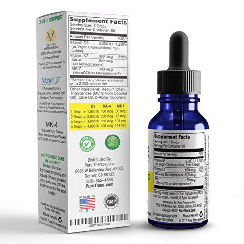 Why you need to take D3 and K2 together Many people take Vitamin D and calcium supplements thinking they're helping their bones, the truth is without the addition of Vitamin K2, such a health regimen could prove dangerous. Without Vitamin K2, the body cannot direct calcium to the bones where it's needed; instead, the calcium resides in soft tissue (like the arteries).* Vitamin K deficiency is widespread-even in healthy adults. To get the range of benefits that Vitamin K offers, you must take Vitamin K2 as a supplement, food sources are limited, at best. Vitamin K2 is a fat-soluble substance and is needed for normal blood coagulation. Vitamin K2 has been shown to inhibit calcium deposits (i.e., calcification) in blood vessels and even improve arterial flexibility.* Why you need both MK-4 and MK-7 - MK-4 and MK-7 are distributed differently and activate different proteins in the body, but both are equally essential for good health* - MK-4 is the key Vitamin K2 found in the brain * - MK-4 travels across the placenta to the developing fetus. MK-7 does not reach the fetus * Vegan D3 + K2 "Full Spectrum" contains 100% PURE TRANS MK-7. Trans MK-7 is the most absorbable form, as it's found in nature / whole foods and is recognized and absorbed by the body. The CIS form of MK-7 is not nature-identical and has limited activity/absorption. All Pure Therapeutics Formulas Meet or Exceed cGMP Quality Standards. This product is manufactured in the United States in a GMP-certified facility.Feature