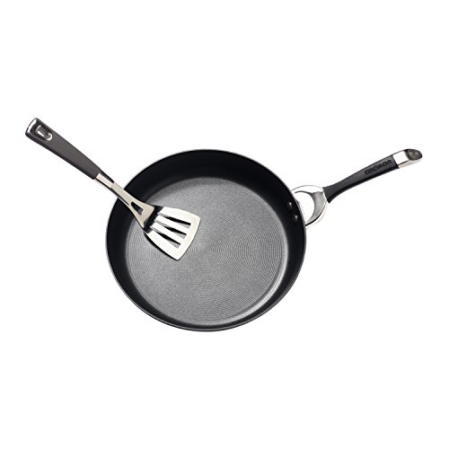 The skillet's attractive exterior adds style to any kitchen decor; heavy duty hard-anodized aluminum construction delivers lasting durability
