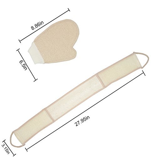 - ★ Loofah back scrubber size: 27.95” * 3.15”, bath glove size: 8.86”*6.5”, they are optimal for cleaning the back, neck, shoulders, feet, and hard to reach areas.