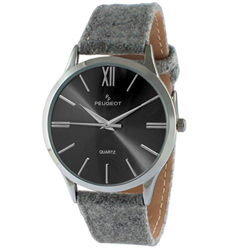 -. Binding : Watch -. Brand : Peugeot -. Color : Grey -. Department : Unisex-adult -. EAN : 0734213205814 -. Feature : Super Slim Case Case Width: 40 Band Width: 20mm / Unique wool tweed fabric that inspires a vintage, yet sophisticated style. Strap back crafted from super soft genuine leather in order to provide the softest & most comfortable feel on the wrist. / Applied silvertone Roman Numeral & Sunray Dial / Reliable Quartz accurate movement manufacturered by Seiko / Backed by Peugeot's industry leading Limited Lifetime Warranty and FREE lifetime battery replacement (details found on warranty) -. Label : Peugeot -. Manufacturer : Peugeot -. Model : 2058GY -. MPN : 2058GY -. PackageQuantity : 1 -. PartNumber : 2058GY -. ProductGroup : Watch -. ProductTypeName : WATCH -. Publisher : Peugeot -. Studio : Peugeot -. Title : Peugeot Silver Slim Case Grey Wool Strap Watch -. UPC : 734213205814