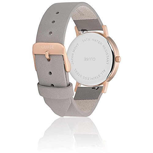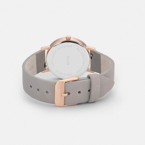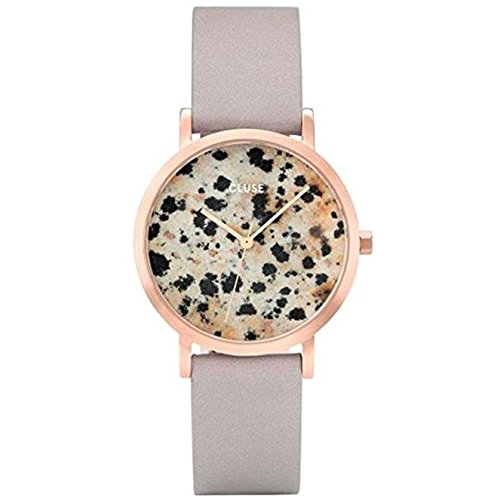 Designed as a tribute to one's uniqueness, this limited edition CLUSE La Roche Petite watch features a real dalmatian stone dial. Every piece of this natural stone has a natural, one-of-a-kind spotted pattern, which makes each La Roche Petite Dalmatian timepiece entirely unique. this model features a 33 mm case with a matte rose gold finish and a grey leather strap for a bold and stylish look.Feature