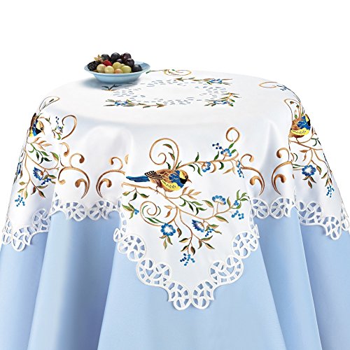 -. Feature : Embroidered toppers feature colorful birds perched on a tree branch surrounded by blue flowers / Intricate design has an open, lacy cutwork border with scalloped edges. Lovely on their own or with a coordinating tablecloth underneath (sold separately) / Machine washable; Made from polyester / Sizes available in runner (69 1/2"L x 13 1/2"W) or square (34"Sq.) / Shop with confidence! For over 50 years, Collections Etc has been bringing unique, whimsical, inspirational, and home solution products to customers. All Collections Etc products come with a 60 day, easy return policy and 100% satisfaction guarantee