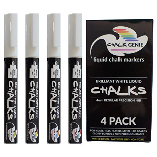 Chalk Genie Brilliant White Liquid Chalk Markers - 4mm Regular Bullet Point Tip - Pack of 4 - Premium Quality Chalk Marker Pens - For NON-POROUS Surfaces
