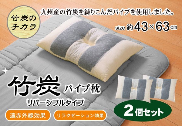 【商品名】枕 ピロー 国産竹炭パイプ入り 『竹炭リバーシブル枕』 2個組 約43×63cm リバーシブルタイプ