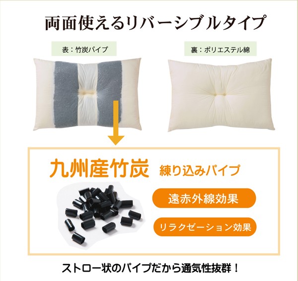 竹の子の産地である福岡県八女郡立花町産の竹炭を練り込んだパイプを使用しています。竹炭には(1)遠赤外線効果(2)リラクゼーション効果などがあります。リバーシブルタイプで竹炭パイプ側、ポリエステルわた側の2種類の触感が楽しめます。