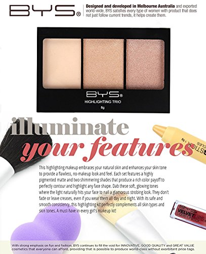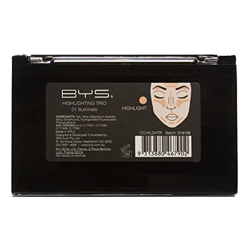 Studio : BYS Publisher : BYS Binding : Health and Beauty Product Description Achieve a naturally glowing face as you illuminate your features with the BYS Highlighting Trio Palette.