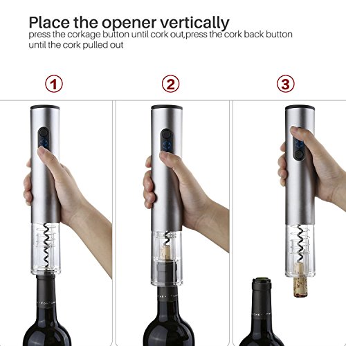 4.What you need to do are placing batteries in position, cutting foil, aligning the drill bit with the center of cork, and slightly pushing button to remove cork from bottle. And then you can push button to release cork from opener. The removing and releasing will spend several seconds only. All the processing is effortless, visualized and in one step.