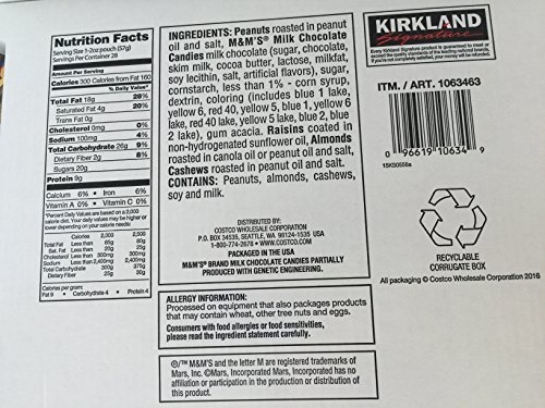 -. Feature : 2oz Snack Pack - 28 per box / Trial Mix - Peanuts, raisins, M&M's, Almonds, Cashews