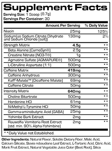-. Feature : Zero artificial sweeteners, zero artificial colors, zero artificial flavors, zero sugars / Potent combination of high-powered thermogenic compounds / Efficacious dose of creatine nitrate in every serving / Infinergy energy blend for maximum receptor sensitivity, choline bitartrate for focus and infused with agmatine sulfate for muscle-swelling pumps and nutrient transport / Zero excuses not to experience 30 mind-blowing workouts